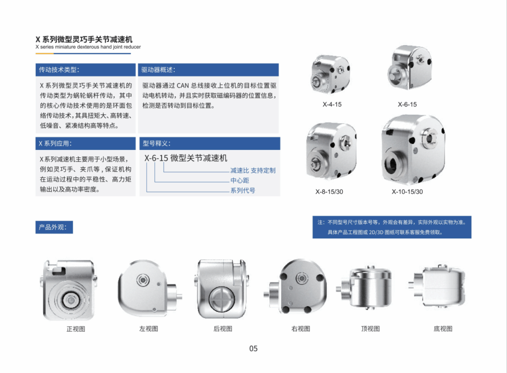 • 在体积方面,陶世环面包络减速器以其先天的90°正交传动结构,省去了额外的转向装置,使整体结构更加紧凑。以应用于机器人灵巧手的X系列减速器为例,重量仅9-49克,却能够实现1-3N·m的扭矩输出,完美解决了空间受限场景下的传动需求。