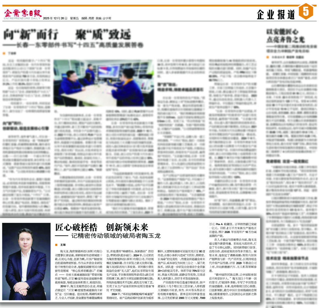 近日,陶世智能科技(深圳)有限公司创始人、董事长兼总裁陶玉龙先生,因其在精密传动领域实现的革命性突破与卓越的企业家领导力,荣登国家级权威经济媒体《企业家日报》,接受独家专访。该报道以《匠心破桎梏 ,创新领未来》为题,深度剖析了陶玉龙董事长从洞察行业痛点、历经八年技术攻坚,到最终带领陶世智能打破国外技术垄断、引领国产精密传动迈向世界的奋进历程。